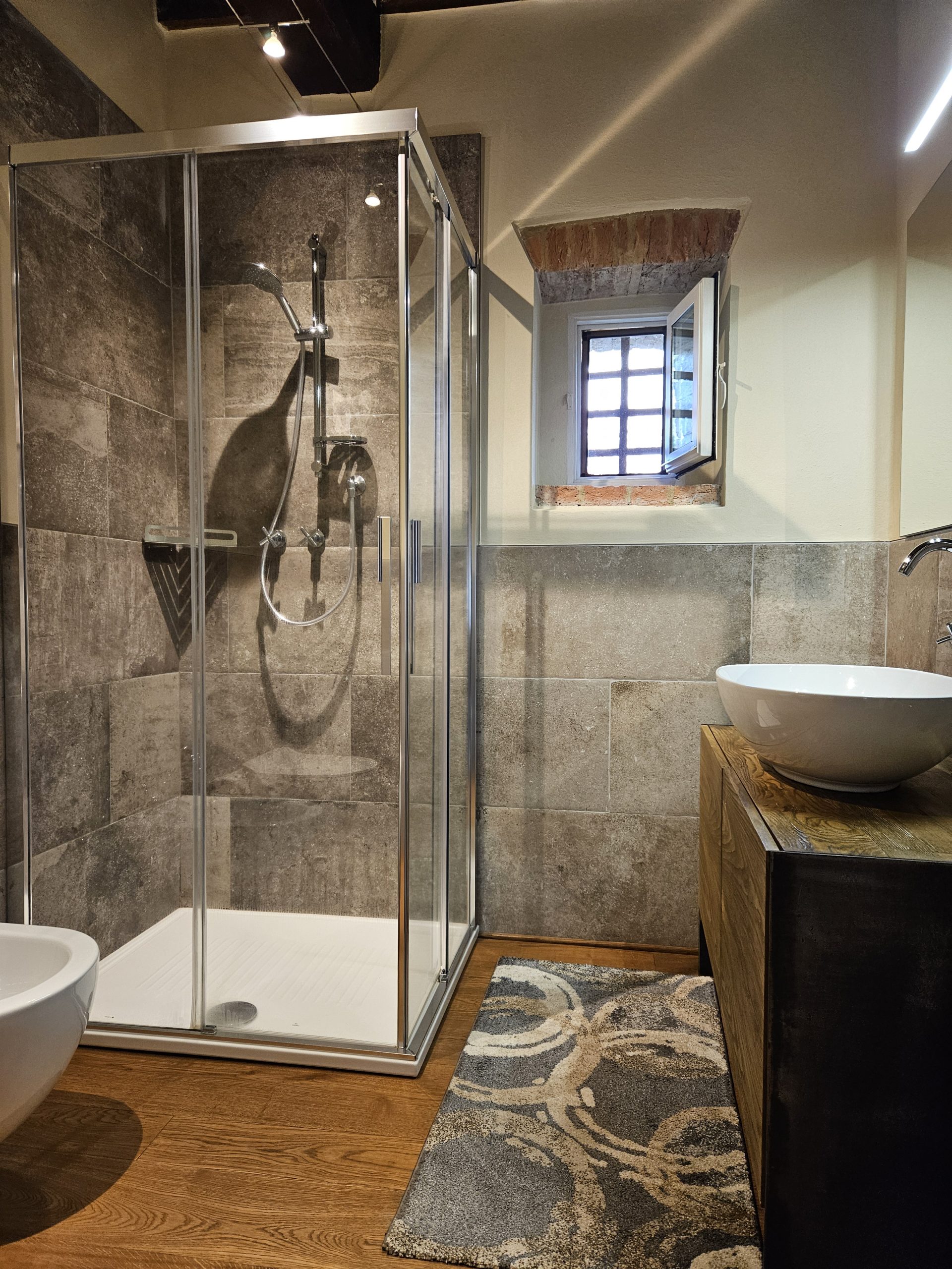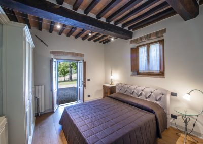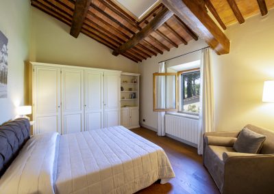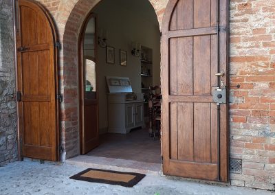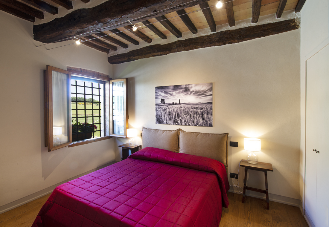 Toegankelijk via een trap voor exclusief gebruik; het appartement meet ongeveer 90 vierkante meter en is gelegen op de eerste verdieping van het centrale gebouw. Het terras kijkt uit over het kleine dennenbos van de boerderij en de steeneikenbossen gelegen in het westen, de ramen bieden als panorama Montalcino en de Monte Amiata.