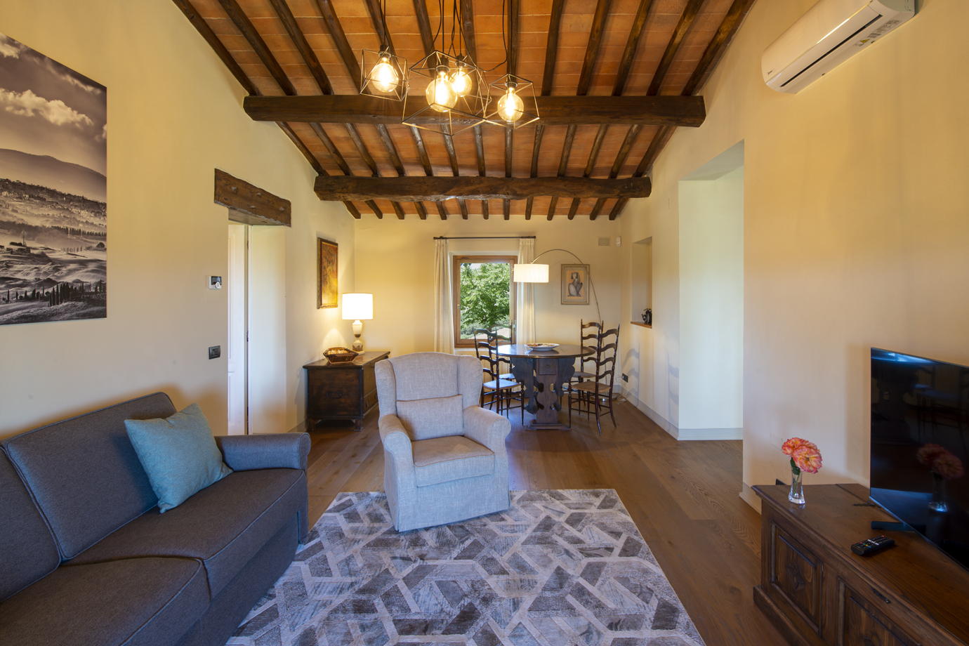 Het appartement heeft een oppervlakte van ongeveer 120 vierkante meter en beslaat de gehele eerste verdieping van de oostkant van de structuur. Toegang tot dit appartement is mogelijk via een buitentrap voor privégebruik die leidt naar het terras, waar het mogelijk is om te lunchen en dineren. De ramen, naast uitzicht op een vijver, bieden een panorama dat 180° van de Monte Amiata naar de Crete Senesi en van de heuvels van Val d’Orcia tot die van de Chianti gaat.