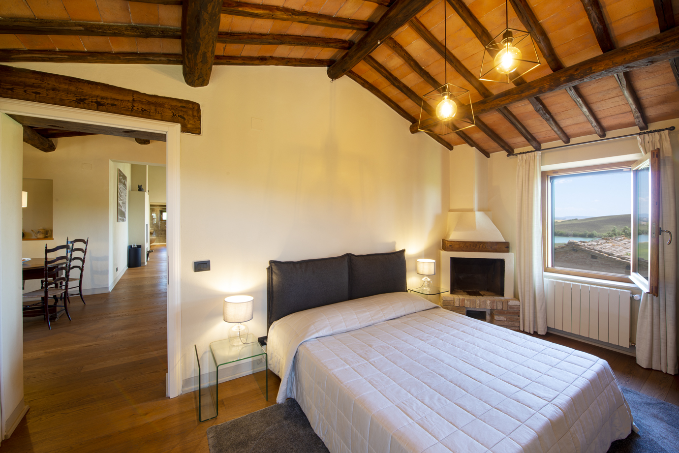 Met een oppervlakte van circa 120 vierkante meter is het appartement gelegen op de begane grond en is verdeeld over de drie zijden van de boerderij. In het noorden kunt u genieten van het uitzicht op de tuin, inclusief het zwembad, in het oosten van het meer en de Crete Senesi tot aan de Chianti-heuvels, terwijl u in het zuiden dan weer Montalcino en de Monte Amiata kunt bewonderen.